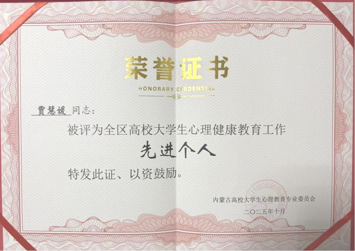 我校心理健康教育工作凭借扎实的体系构建,显著的育人成效与积极的创新实践,荣获“全区高校大学生心理健康教育工作先进单位”称号;贾慧媛老师荣获 “全区高校大学生心理健康教育工作先进个人” 称号。