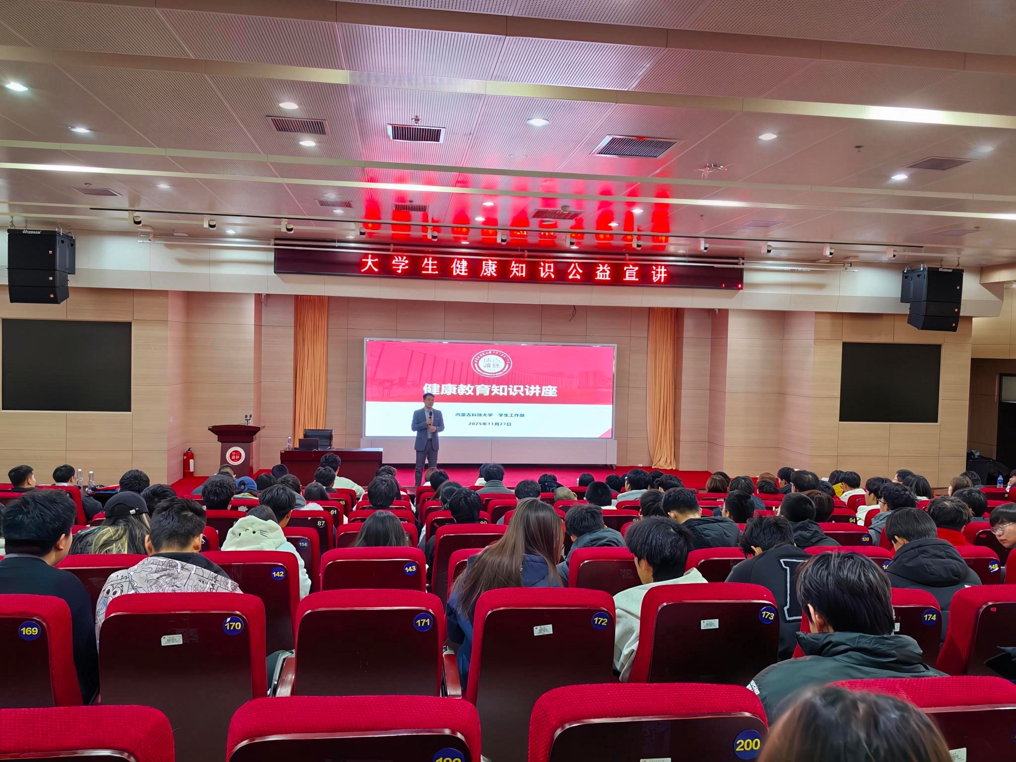 为深入贯彻落实国家“健康学校建设”与“体重管理年”三年行动方案,2025年11月27日下午,学生工作部在图书馆B201教室成功举办大学生健康知识专题讲座。本次讲座特邀高级营养师、健康讲师杨占新担任主讲,面向2025级学生系统讲解了健康学校政策、体重管理计划及饮食安全等内容,引导学生树立科学健康观念,提升自我管理能力。